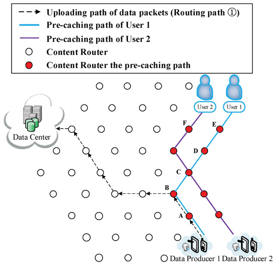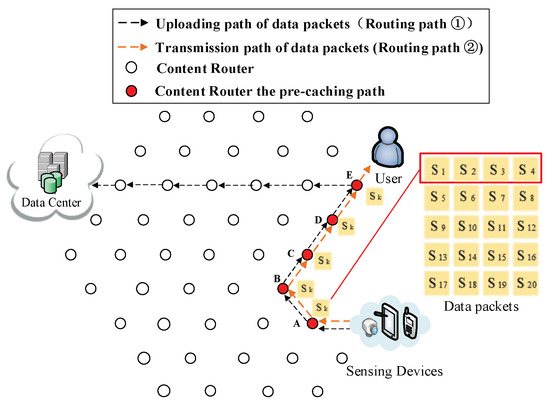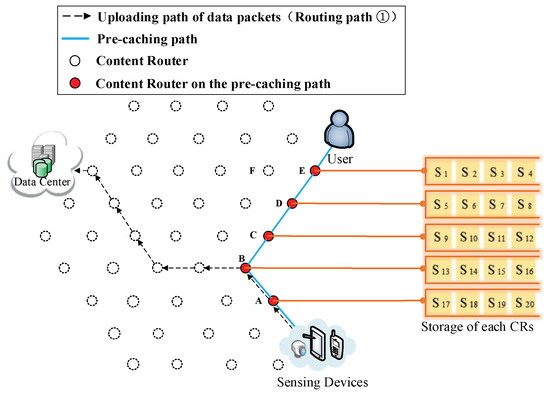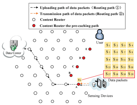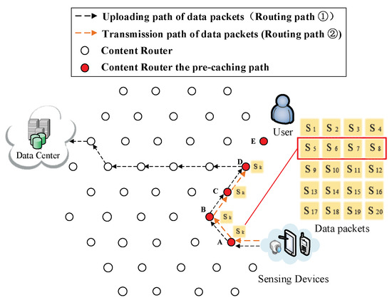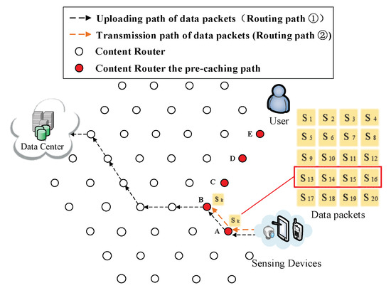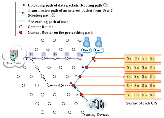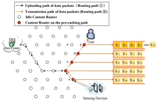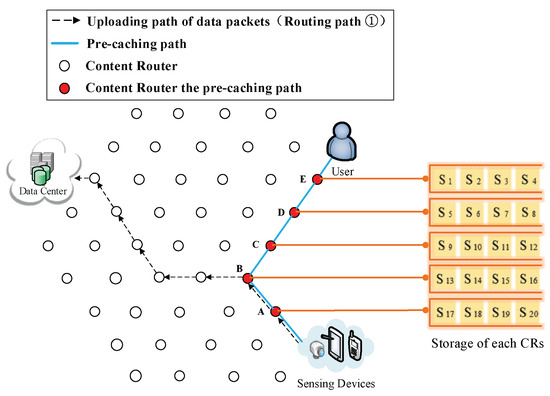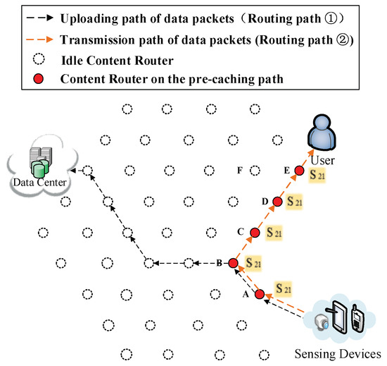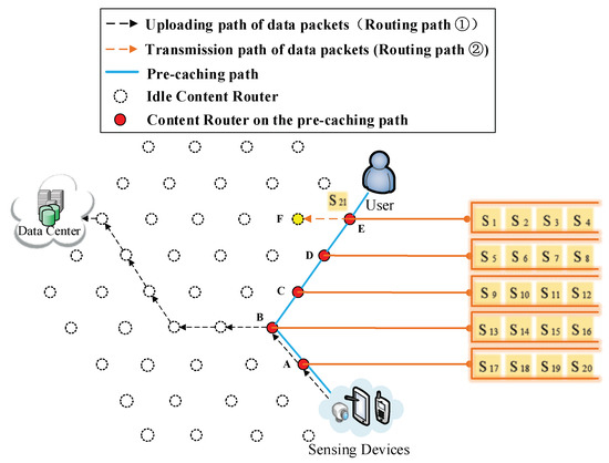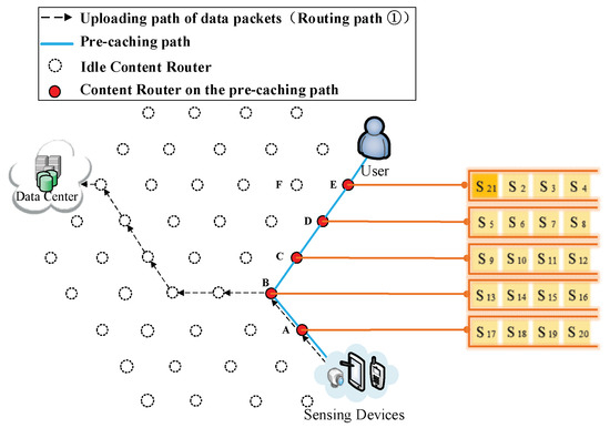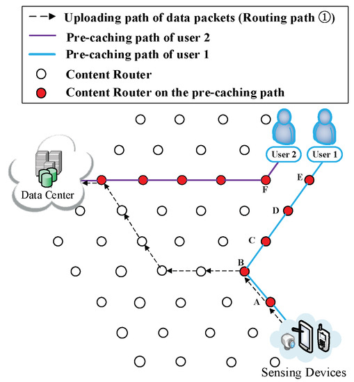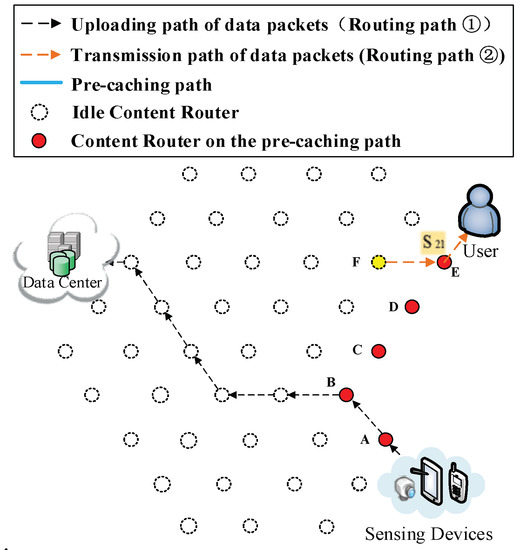 (1) Two shortcut routing methods are proposed to reduce the burden of network and enhance uses’ QoS. The first shortcut routing method is to build shortcut from DPs to users. In the SCN, the sensed data collected from sensing devices has to be uploaded to DCs before it can be requested by users later. However, sensing devices and users are both located on the edge of network, which means that sensing devices (DPs) and users are close to each other. Making use of this advantage in distance, the data could be directly sent to users after the formation of the shortcut. The second shortcut routing method will choose a Content Router (CR) that could yield shorter overall length of uploading routing paths, and then data packets are uploaded through this chosen CR. In this method, the uploading path shares some segments with the pre-caching path thus the overall length of routing paths is reduced. By implementing these shortcut routing methods, the latency for users to get their interested data would decrease and a better QoS could be guaranteed.