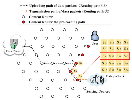 Rapid advances in the manufacture of sensing devices such as smartphones [1,2,3,4], iPad or other sensing nodes [5,6,7,8,9] have expanded the range of ubiquitous sensing applications in the Internet-of-Things (IoT) [3,9,10,11,12,13], such as monitoring and gathering information from public infrastructure [14,15,16,17,18], natural disaster relief [19,20], healthcare [21,22], smart homes [23,24], and industries [11,16,17,25,26]. The enormous number of ubiquitous sensing (US) devices provides an immense number of data (in this paper, the term “data” refers to videos, sounds, pictures or other forms of information that could be collected by sensing devices) for Information-Centric Networking (ICN) [27], which is an emerging network architecture with the potential to solve a great variety of issues faced by traditional network [27]. In addition, those applications formed the so-called Sensor-Cloud Network (SCN) [28], which is an emerging network architecture of ICN [27]. In such a network, many sensing devices which are deployed on the network edge are used for collecting data [2,4,29,30,31,32,33]. Then, sensing devices send data to cloud [28,34], where Data Centers (DCs) are located. Finally, users get requested data from DCs. Ubiquitous sensing devices, including smartphones, cameras and iPads have been changing the ways we interact and communicate dramatically, which lead to remarkable changes in the existing network [35,36,37,38,39]. On the one hand, it is the enormous number of these ubiquitous sensing devices that make it possible for data to be collected and sensed in such a huge scale [25]. According to the statistics [1,3], the total number of sensing devices (smartphones and industrial sensing devices) that are connected to the IoT network had reached 90 billion in 2011, which outnumbered the global population by that year. Moreover, this number is expected to ascend by 240 billion in the immediate future [1,3]. On the other hand, the growth of streaming traffic has also shown an exponential trend under pervasive sensing [1,3]. Due to these powerful sensing devices, people could sense videos, sounds and photos anytime and connect their devices to the Internet using various access channels. The convenience brought by sensing devices make it possible for hot events, regional conflicts and political issues to be spread worldwide almost simultaneously. Because of the colossal number of sensing devices around the world, the number of data produced by the IoT has been rising exponentially [1,3,40,41]. Reports from Cisco illustrate that the network flow of streaming produced by the IoT had accounted for 69% of the total flow in 2014, which had increased to 30-fold of the total network flow in 2000. This number is expected to grow more dramatically in the future [1,3].