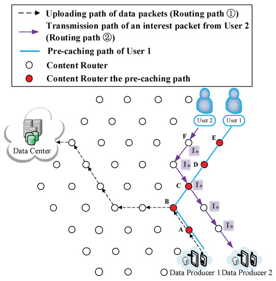 Along with far-reaching development of the Internet, the traditional TCP/IP network has shown many defects facing the rapid growth of network scale as well as an ever-increasing number of data. These problems include low network performance, poor QoS and inefficient data transmission among DPs, DCs and users. Therefore, researchers carried out many relevant studies to improve data caching mechanisms, architectures of network and routing methods [27,49,50]. As a future network architecture, Information-Centric Networking (ICN) [27,51] has brought much attention from both academia and industry. In ICN, named data become a major unit of network transmission, Named Data Networking (NDN) [27,51] is a paradigm of ICN architecture. In NDN, the IP in middle layer is replaced by the named data. The transmission of data follows a “publish-request-respond” model which directly uses the named data in routing, thus the efficiency from point to multi-point transmission is improved.