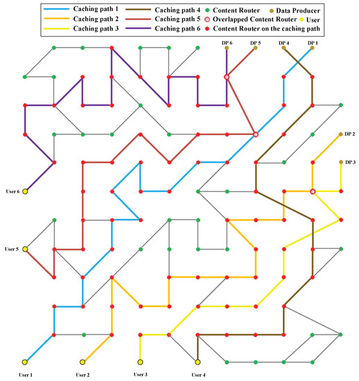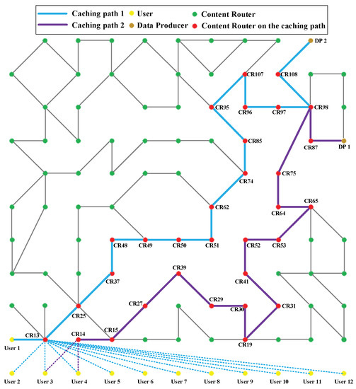 (1) Minimization of the total hop counts for users to obtain data. Assume that the path for users to obtain data is the same as previous definitions: and . Then, the length of the th routing path is denoted as = . The first objective in this paper is to minimize the hop counts that users obtain their interested data, as demonstrated by Equation (1).