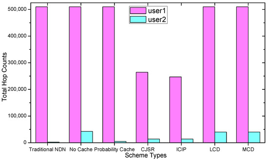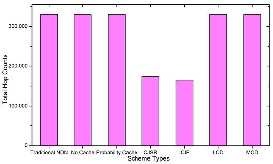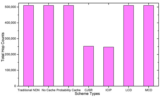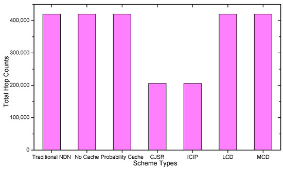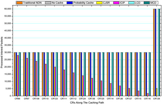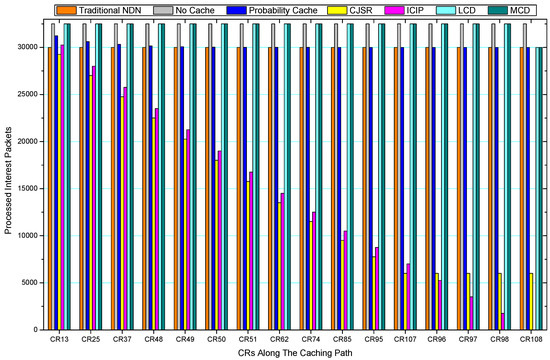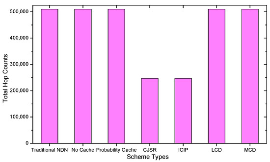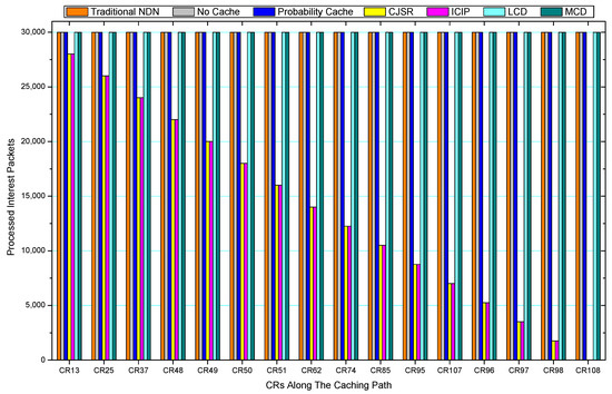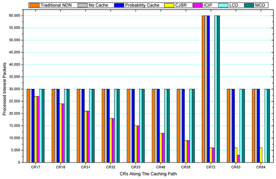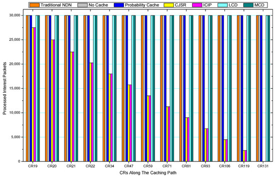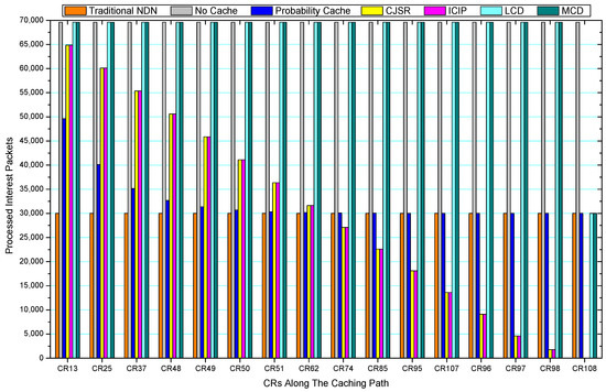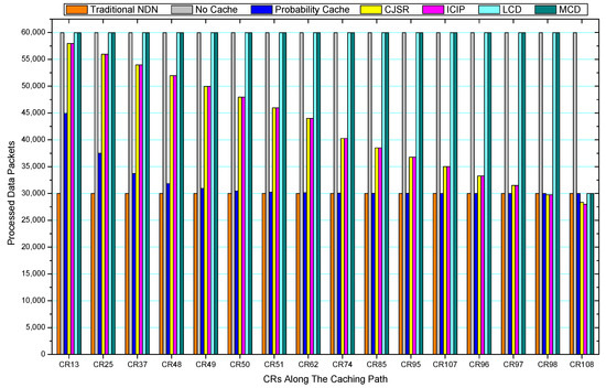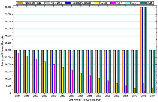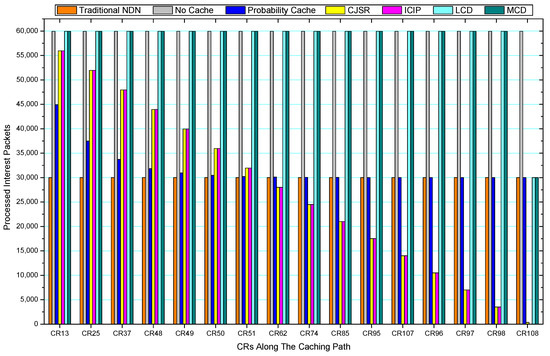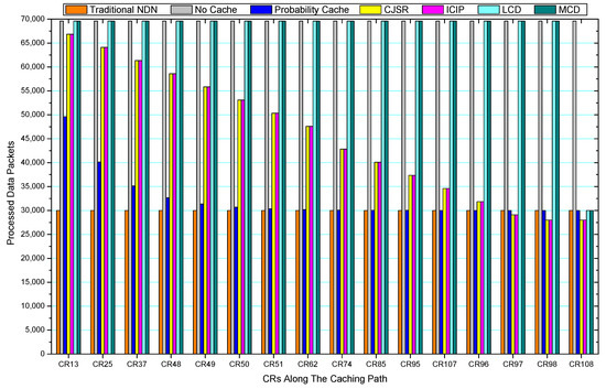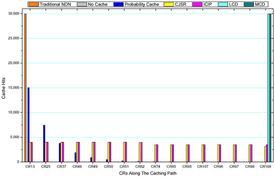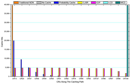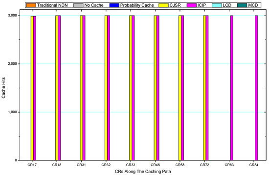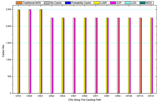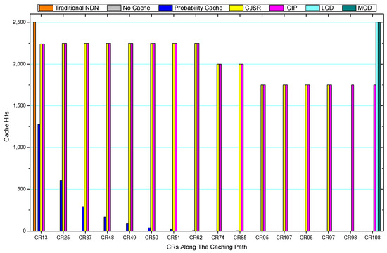 Comparisons between our schemes and the existing caching strategies are depicted in Figure 52, Figure 53, Figure 54, Figure 55, Figure 56, Figure 57, Figure 58 and Figure 59. Figure 52 demonstrates that proposed schemes’ cache hits noticeably outnumber the remaining policies. As illustrated in Figure 53, Figure 54 and Figure 56, all the cache hits of the traditional NDN scheme occurred at (CR 13) and all of cache hits of the LCD and MCD schemes took place at (CR 108). Figure 57, Figure 58 and Figure 59 also show that all the CRs along the have high cache hits because latter requests from the same user could benefit from providently cached data. As for the other schemes which have no cache hits at all, each CR only forwards packets. Because data packets are cached to CRs near the users intelligently. Due the involvement of idle CR, the conflicts of data replacement are solved. Thus, cache hits occurred throughout each entire caching path in the ICIP scheme. On the contrary, the DP in the remaining schemes only start to generate data packets when an interest packet is received, then the DP forwards the requested data to users in a time-consuming way.