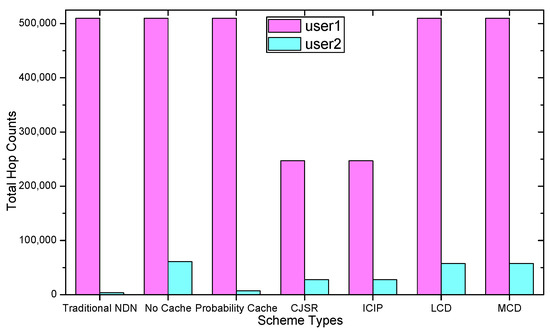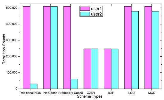 In conclusion, vertices that are closer to the user usually had been accessed more frequently in the CJSR scheme and the ICIP scheme, while the burden for the other three schemes is high and remain unchanged as the hop counts get larger. Seen together, the line charts reveal that, in our schemes, the burden of DP or DC was partially taken by CRs. As a result, the burden of dealing with endless packets are reduced and the users get better QoS. The reason is that, in the proposed schemes, interest packets only have to be forwarded to CRs with the corresponding data packets cached. On the contrary, the remaining schemes always have higher number of access because that interest packets have to be forwarded by each CR because data packets are not providently cached for user to fetch.