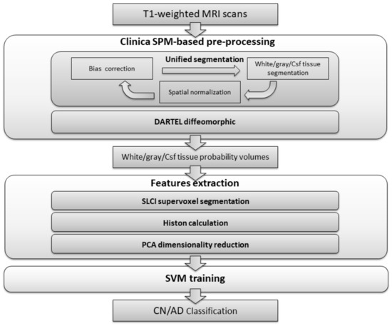 The classification process presented is divided into three stages, as can be seen in Figure 1. In the first stage, the dataset is processed in order to carry out bias correction and spatial normalization, and to obtain a white matter/grey matter/cerebrospinal fluid segmentation. In the second stage, we calculate a set of histons to be used as a feature vector. To provide a natural neighbourhood for the histon-calculation process, we carry out an over-segmentation using the aggregate volume for GM, WM and CSF. Finally, feature reduction is achieved by means of PCA and the resulting feature vector is used to train an SVM-based classifier.