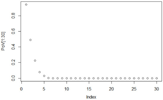 To decide the suitable size of the PCA-based dimensionality reduction, the scree graph method is used. The scree graph [59] shows the the eigenvalues of the covariance against number of principal components. The scree test is used to decide on the size of the feature vector via visual analysis, by looking for a “break” between the components with relatively large eigenvalues and those with small eigenvalues. When the curve bends displaying an “elbow”, it is assumed that the variance explained will not increase significantly with the addition of mere eigenvectors. Figure 4 shows the scree graph, plotting the variance explained in terms of the first 30 main components of the dataset analysed. As can be seen, the elbow occurs between the 5th and 6th principal components; therefore, the first five components appear to be enough to describe the variance in the data.