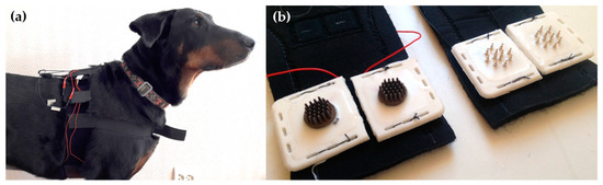 (a) The second version of the neoprene harness placed on the dog; (b) Polymer and gold electrodes attached to the neoprene harness.