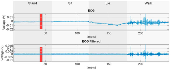 Illustration of the measured and filtered ECG data. Red rectangles denote the parts of the original signal that will be depicted in detail in Figure 6.