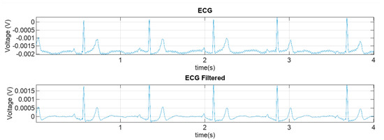 Zoomed-in raw and filtered ECG data. The data comes from the original signals presented in Figure 5 that are marked by red rectangles.