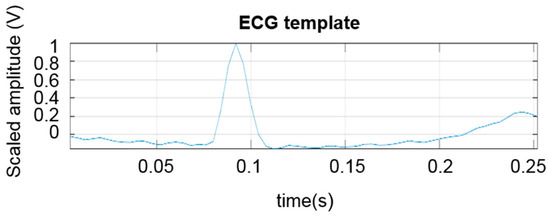 The processing was carried out by first applying a fourth order 2–30 Hz Butterworth forward-backward band pass filtering. Next, a pattern finder procedure was applied to the filtered data to find individual heartbeats in the ECG and to obtain the HR. In this procedure, first a typical template (Figure 7) of ECG pattern is selected. In particular, the pattern was obtained by visually analyzing the filtered ECG data and selecting a typical ECG pattern. The template pattern contains all essential components of an ECG from P to T waves in order to minimize the false detection of the complexes. This templated pattern was 250 ms in length in all analyzed computations. The template length was selected empirically to contain all the ECG components of one cardiac cycle from atrial depolarization (P-wave) to ventricular repolarization (T-wave). Next, the template was normalized such that the maximum value of the template (R-peak) corresponded to a value of 1 and all other values in this ECG vector were scaled linearly with the same normalizing factor.