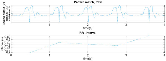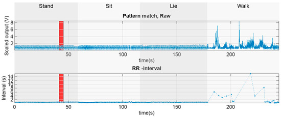 Raw pattern match data and its respective RR interval graph. Red rectangles denote the parts of the original signal that will be depicted in detail in Figure 9.