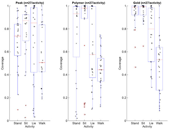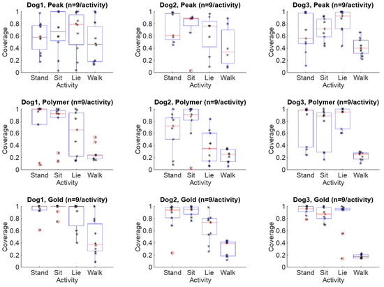 The heart rate/heartbeat detection coverages for each electrode type and activity obtained with all three dogs and in all test repetitions (n = 27/activity) are presented as boxplots in Figure 10. In Figure 11, the same results are presented for each dog separately (n = 9/activity).