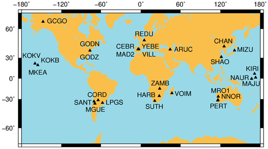 In order to analyze the performance of GF and GB WL ambiguities and evaluate the orbit and clock effects on the WL ambiguities, we implemented the GF and GB models using raw observations to compute L1, L2 and WL ambiguities as well as their variance-covariance as described in Section 2 and Section 3. GNSS measurements with 1 s interval from selected IGS sites are downloaded from the IGS data base. These sites are deliberately selected and spread over main continents and the middle of the Pacific in terms of groups, see Figure 1. Some groups have sites located very nearby in order to have almost the same LOS. Two types of orbit and clock products are used in the experiment. One type is the determined orbit and clock products provided by ESA to the IGS, while the other is the real-time orbit and clock estimated as described in [15]. The interval of satellite orbit is 15 min, and the sample rate of satellite clock is 30 s for both types of products. The determined products are obtained by the post-processing mode, and their accuracy is better than that of real-time ones [15]. The standard GB PPP solutions, in parallel with the GF process, are computed using raw L1 and L2 observations. The parameters to be estimated are tropospheric zenith delay, ionosphere, receiver clock bias, and L1, L2 and then WL ambiguity terms for the GB process, while the GF process just produces the L1, L2 and then WL ambiguity terms. The positions of sites are fixed to the “ground truth”, which are computed from many days’ data with the static mode. This contribution makes use of the precise coordinates in order to determine precisely the GB-GF ambiguities by avoiding of the effects of unknown coordinates. The orbit and clock are integrated and interpolated for each epoch (1 s of data interval). Strictly speaking, the interpolation for real-time orbit and clock is not realistic in the real-time application as the future correction stream cannot be known in advance for interpolation of current epoch. However, we employ exactly the same process in order to carry out a fair comparison for both types of products by ignoring correction age effects. The elevation-dependent data weighting is used for both processes. The entire process is implemented through a strictly forward computation.