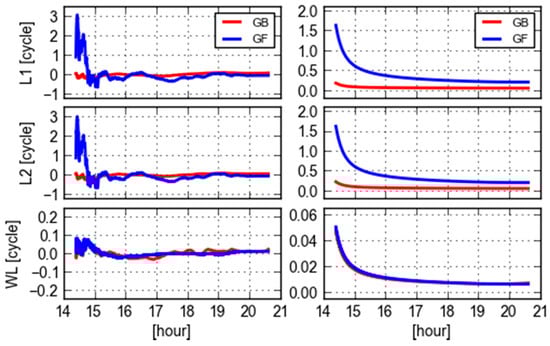 GF (blue) and GB (red) L1, L2 and WL ambiguities (left) and their corresponding formal errors (right) of PRN 09 computed using a single receiver (REDU) observations and ESA final orbit clock products.