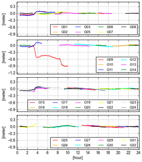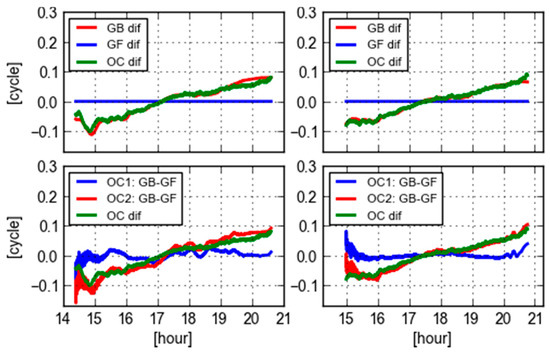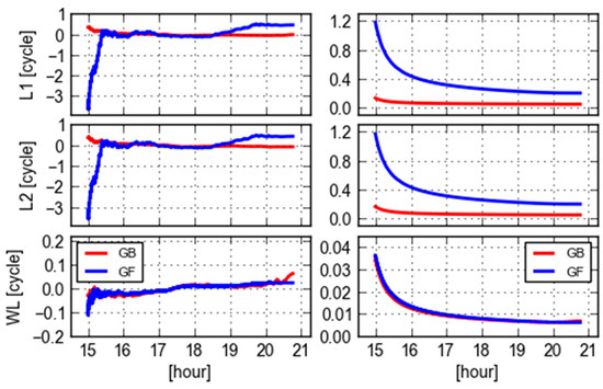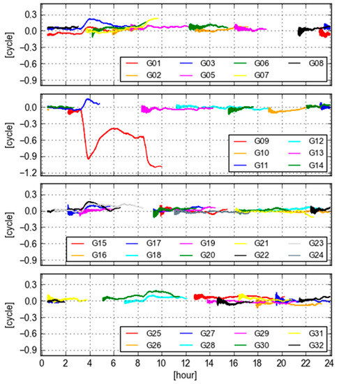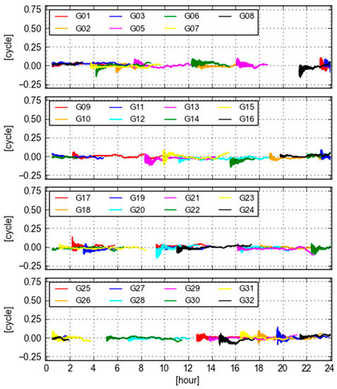Figure 7 displays the values of GB-GF WL ambiguities computed with real-time orbit and clock products at site KOKV for all visible GPS satellites. During the period of 2–12 O’clock, the variations of these time series are larger than the rest of day. In particular, the largest variation is from PRN 09, which is even larger than 1.0 cycle during 9–10 O’clock. The bias and the standard deviation are −0.569 and 0.305 cycle according to the statistics. In this case, the GB and GF WL ambiguities are not equivalent.