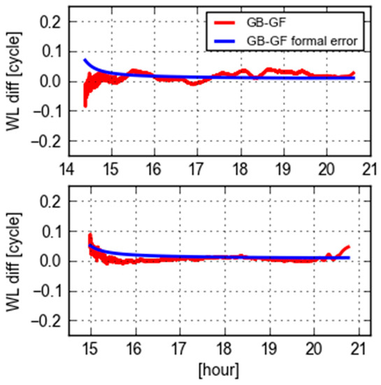 Orbit and clock have no impact on GF WL ambiguities as they are eliminated in the process, while they have effects on GB ones. Whether the GB and GF ambiguities are equivalent depends much on the quality of the used orbit and clock. In general, if GB-GF WL values are stably in between ± 0.1 cycles or within three times of their formal errors, we could state that the GB and GF WL ambiguities are equivalent. This is basically not an issue for the final orbit and clock product used in our experiment, as this type of product is obtained from post-processing.