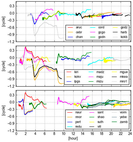 Figure 9 displays GB-GF WL ambiguities of PRN 09 computed with real-time orbit clock products for all selected sites. It is obvious that these time series are not stable. The figure discloses longer period of oscillations than one single site shown in Figure 7. We could also see that the variation patterns are almost the same for some pairs of sites, e.g., KOKB and KOKV, KIRI and NAUR, MIZU and SANT, MRO1 and PERT. These pairs of sites have different observations, but demonstrate the same GB-GF WL patterns, as they suffer almost the same orbit clock error. It is clear in this case that the GB and GF WL ambiguities are not equivalent.