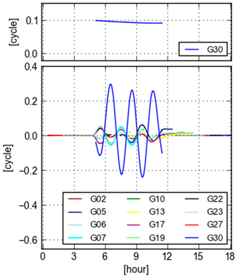 The bottom panel demonstrates the GB-GF WL effects after the time-variant errors are added into the PRN 30 during 5:00 h–11:30 h. Firstly, the effects of PRN 30 show also the sine or cosine behavior. Secondly, there are also similar patterns with smaller magnitude in many other satellites tracked in the same period. These effects are brought by the added errors with only 0.15 m in (absolute) size, which is much smaller than 1.0 m. This indicates that the GB-GF WL ambiguity is very sensible to time-variant errors as analyzed in Section 4.1, which provides an opportunity for real-time user to evaluate the quality of real-time orbit and clock.