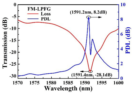 The polarization characteristics of the 4MF-LPFG were investigated using a tunable laser (Agilent Model 81940A, Agilent Technologies, Santa Clara, CA, USA) and an optical power meter (Agilent Model N7744A, Agilent Technologies, Santa Clara, CA, USA). Polarization-dependent loss (PDL) for LPFG samples was measured at the resonant wavelength of 1591.4 nm. A maximum attenuation of −28 dB was observed as shown in
