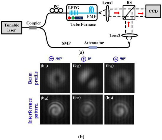 ±1 modes in the LPFG with a grating pitch of 1200 µm and a grating resonant wavelength of 1588.1 nm. The LPFG was placed in a tube furnace with a resolution of 0.01 °C. A tunable laser (Model 81940A, Agilent Technologies, Santa Clara, CA, USA) was utilized with wavelengths ranging from 1520 to 1620 nm. The light beam from this laser was divided into two branches by a fiber coupler (90:10). One part of the light (90%) was propagated into a polarization controller (PC) and an achieved 4MF-LPFG to generate OAM modes, and then collimated into a beam splitter (BS) through a lens (Lens1). Another part of the light (10%) was propagated into an attenuator and then collimated into the BS through another lens (Lens2) as a reference beam. The intensity of the reference beam was controlled to achieve clear interference patterns by the tunable attenuator. The generated OAM modes from the 4MF-LPFG interfered with the reference beam on the BS. The beam profile and interference pattern of the generated OAM can be observed by use of an infrared CCD (Model 7290A, Electrophysics Corp, Fairfield, NJ, USA).