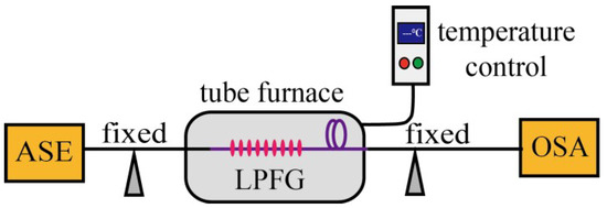 Figure 5. An LPFG with a pitch of 1200 μm was placed in a tube furnace with a temperature range from room temperature to 100 °C. An ASE light source and an OSA were employed to monitor transmission spectrum evolution of the LPFG during heating. The LPFG sample was heated from 30 °C to 100 °C with a step of 10 °C. After a desired temperature was achieved each time, the temperature was maintained for 20 min, and then the resonant wavelength was recorded.