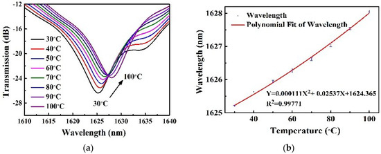 Figure 6b, the corresponding temperature sensitivity is about ~38.6 ± 0.37 pm/°C at the resonant wavelength of 1625 nm, and the similar experimental results were also reported by Wang et al. [