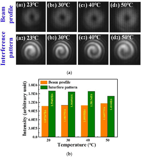 2) that the helical phase of the OAM remained stable while increasing the temperature from 23 °C to 50 °C. Only minor intensity changes were observed as shown in