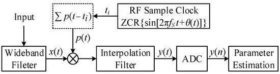 The NYFR architecture [6] is shown in Figure 1. The input analog signal is first filtered by an UWB preselect filter, and then mixed by a non-uniform radio frequency (RF) LOS , which is controlled by zero-crossing rising (ZCR) voltage time of a RF sample clock. Then, the mixer output signal is filtered by an interpolation low-pass filter (LPF) with pass band , and we would obtain as the output of the NYFR. The signal contains the LOS modulation information that can be measured to determine the original RF band. Next, is sampled by an analog-to-digital convertor (ADC) to get the discrete NYFR output, and the sampling rate is equal to the LOS carrier frequency. Finally, information of the original signal is recovered by the corresponding parameter estimation method.