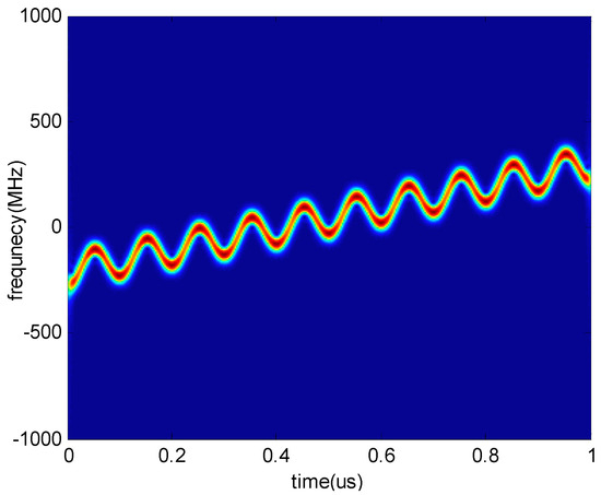Figure 2 shows the time-frequency diagram of an LFM signal sampled by the NYFR. The time-frequency curve of the input LFM signal is superimposed on the sinusoidal frequency modulation of the LOS. The modulation parameters of the SFM part correspond to the values of , which demonstrates the frequency band where the input signal is located. The main parameters estimated in this paper are the chirp rate and the NZ index, which correspond to the slope of the time-frequency curve and bandwidth of the SFM in Figure 2.