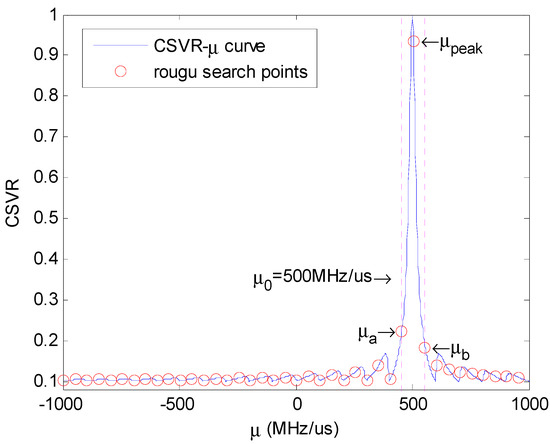 The main lobe width of the SVR spectrum in Figure 6 is . In order to improve the accuracy of CSVR spectrum peak search under low SNR, we set the search interval of rough search as of the main lobe width, i.e., . Thus, by a rough search of in the possible range of chirp rate, we can ensure that the maximum of the results is located within the main lobe of the CSVR- curve.