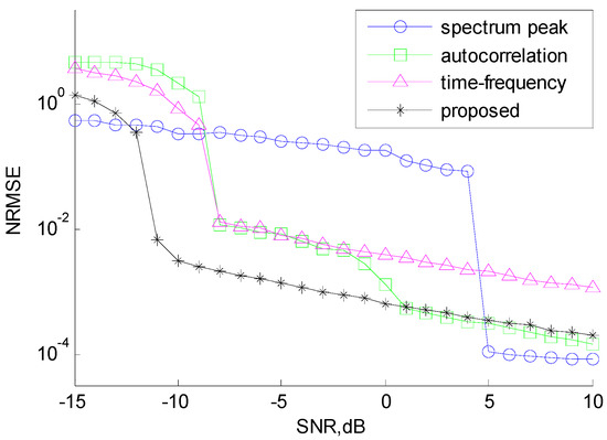 It should be noted that in Figure 8, after correctly estimating the NZ index when SNR ≥ 5 dB, the spectrum peak method can obtain a higher estimation accuracy of the chirp rate by means of high precision algorithms such as Fractional Fourier Transform (FrFT) [26], which is especially suitable for simple LFM signal. However, it is obvious that the spectral peak method needs more computation, requires much higher SNR threshold, otherwise fails under low SNR. Among the four methods, the proposed SVD-based parameter estimation algorithm has the best robustness to low SNR and the most stable estimation performance.