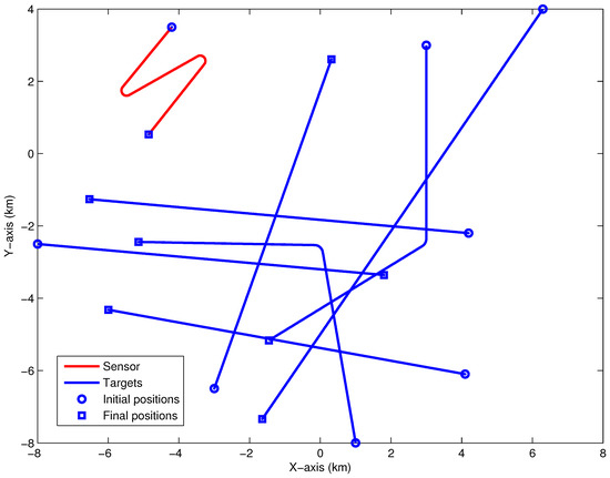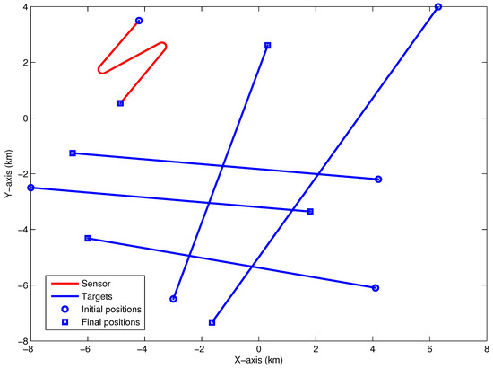 The initial position of the bearings-only sensor installed in a maneuvering moving platform is . To satisfy the observability condition, the sensor platform firstly moves at a speed of 5 knots and changes its course twice: the first one changes from to from the time 840th seconds to 1360th seconds, and the second time changes from to from the time 1860th seconds to 2040th seconds. In this paper, we define the positive direction of measurements is that the clockwise rotation from the positive Y-axis. In different periods, the number of targets changes along with time and Table 1 shows the motions of all targets. Targets , , , , start to move from the initial point , , , and , respectively. Figure 1 presents the moving condition of the sensor and the targets.