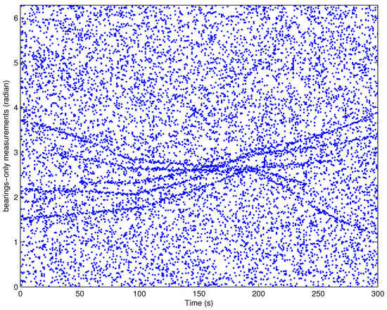 In practical situations, some false measurements originated from clutter may also be detected by the sensor and form an RFS at each time k. These false measurements are always assumed to be uniformly distribute in the sensor detection space. Finally, the bearings-only measurements RFS at time k can be expressed as