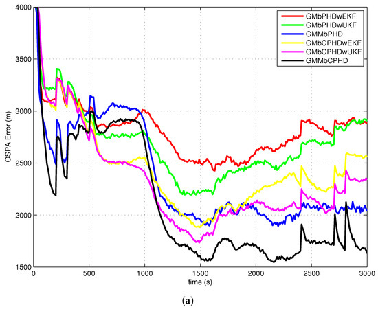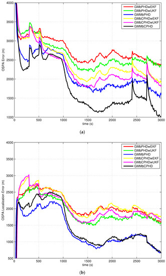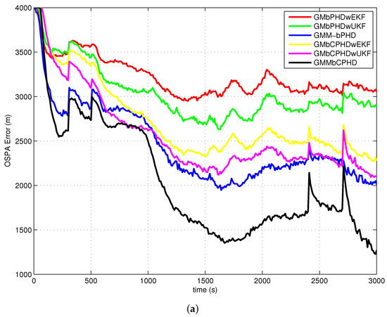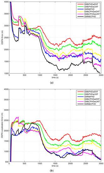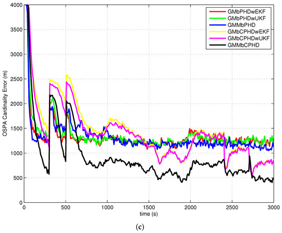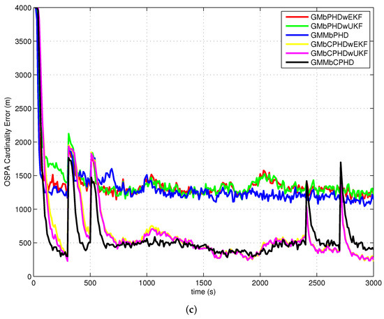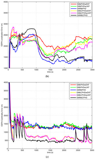 In all simulation experiments, as can be seen obviously from Figure 4a, Figure 5a, Figure 6a and Figure 7a, the proposed GMMbCPHD filter delivers much lower OSPA distance error than other filters. As the nonlinear bearings-only measurement is approximated by Gaussian mixtures using GMM technique which is more accurate than that is approximated by a single Gaussian distribution, the localization estimation of targets in GMMbPHD and GMMbCPHD is much more accurate than EKF and UKF-based filters, such as GMbPHDwEKF, GMbPHDwUKF, GMbCPHDwEKF and GMbCPHDwUKF as shown in Figure 4b, Figure 5b, Figure 6b and Figure 7b. From Figure 4c, Figure 5c, Figure 6c and Figure 7c, we can see that the CPHD-based filters deliver much lower OSPA cardinality error than those of PHD-based filters such as GMbPHDwEKF, GMbPHDwUKF and GMMbPHD as the cardinality distribution has been modeled and propagated properly in GMbCPHDwEKF, GMbCPHDwUKF and GMMbCPHD.