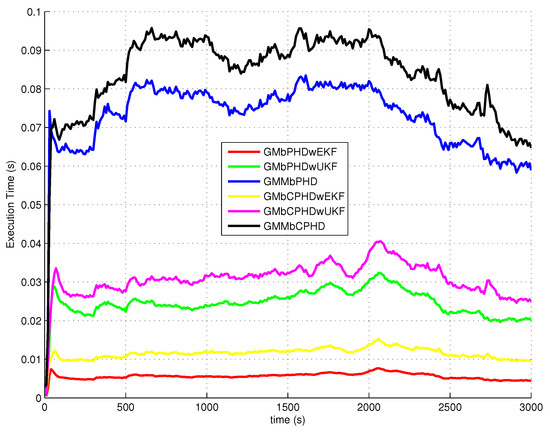 The average OSPA with order 2 and cutoff 400 is used as a metric to evaluate performances of each filter over 500 Monte Carlo runs. The simulation results of experiment 1, experiment 2, experiment 3 and experiment 4 are shown in Figure 4, Figure 5, Figure 6 and Figure 7, respectively. Basically, the OSPA error consists of two parts (OSPA localization error and OSPA cardinality error). To fully show the benefits of the filters, both the OSPA distance and the OSPA components (OSPA localization and cardinality) are also shown in each experiment result. The execution time to show the computational load of each filter in experiment 1 is given in Figure 8.