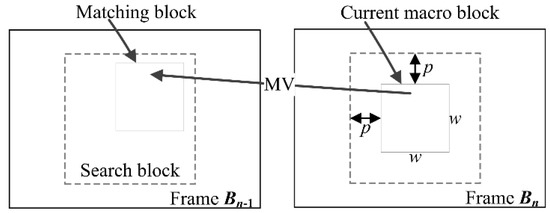 The block matching method divides the current blurry frame into a matrix of macro block and then searches the corresponding block with the same content in the previous blurry frame. The macro block size is w × w and the searched area is constrained up to p pixels on all four sides of the corresponding macro block in the previous frame as shown in Figure 3. When the blur kernel is temporally invariant, all frames have exactly the same blur. As a result, an identical macro block can be found in the previous frame except the edge regions, and then a sufficiently accurate motion vector is derived. Because the exhaustive search block matching method [34] could find the best possible match amongst block matching methods, we introduce it for estimating the motion vector and set the parameters w = 16 and p = 7 as a default.