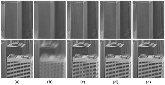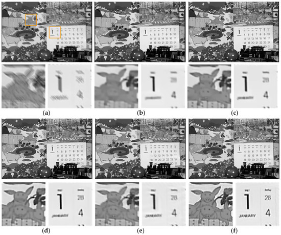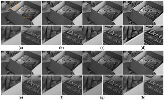 Figure 12 shows the deblurred results of naturally blurry video book by the different methods. Figure 12a is a naturally blurry frame which is randomly chosen from video book, such as the frame in Figure 11a. In Figure 12, the frames deblurred by method [3,4] contain noticeable ringing artifacts while that obtained by method [22] presents massive blocky deformation and loses many details. The deblurring result by method [32] is relatively better than the above methods, but there are multiple ringing artifacts in the object edges, whereas, the results deblurred by our method have sharper edges and better local details than those obtained by the other methods.