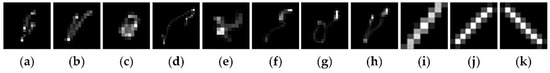 For verifying the effectiveness of the proposed method when restoring artificially blurred videos, we perform comparative experiments on six grayscale videos with several motion types and the results are shown in Figure 5, where the cameras which capture the videos stockholm and shield are quite similar and undergo translational motion and that which captures the video old town cross has depth variance motion. The videos city and tu berlin include both translational and rotation motion, but the former has more details. The video mobile & calendar is a dynamic scene, whose blur is caused by the camera with depth variance motion and the objects with complex motion. The above videos are artificially blurred by the different methods with the blur kernels as shown in Figure 6. The first method is the temporally variant artificially blur method that the frames of a video are convoluted with different complex blur kernels. The second method is that all frame of a video are convoluted with a same linear blur kernel. Figure 6a–h shows the complex blur kernels which are provided from [39] for generating the temporally variant blur video. The blur kernels are generated by camera motion on a tripod. The Z-axis rotation handle of the tripod is locked and the X-axis and the Y-axis handles are loosened. The camera is set as an 85 mm lens and a 0.3 s exposure. The other three blur kernels as shown in Figure 6i–k is the linear blur kernels for generating the temporally invariant blur video. The direction of the three blur kernels are 60, 45 and 135, respectively. In addition, we add the Gaussian noise with standard variance as 0.001 to the blurred frames. In order to avoid the negative influence of the single image deblurring method, we assume that the first latent sharp frame is known in subsequent experiments, which should be obtained by the image deblurring method in reality.