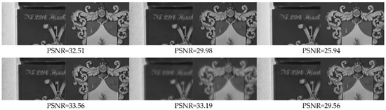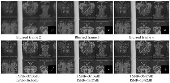 The proposed method can be used to remove temporally variant motion blur as shown in Figure 10. In the circumstance, because the blur kernel of each frame may be different, the motion vectors are estimated by the ORB method. The top of Figure 10 shows three consecutive artificially blurred video sequences which are blurred with the frames 2 to 4 from video shield and the random blur kernels, such as Figure 6c,e,h. The bottom of Figure 10 is the corresponding deblurred frames by our method, which have sharp edges and visible details, as well as high PSNR and ISNR values.
