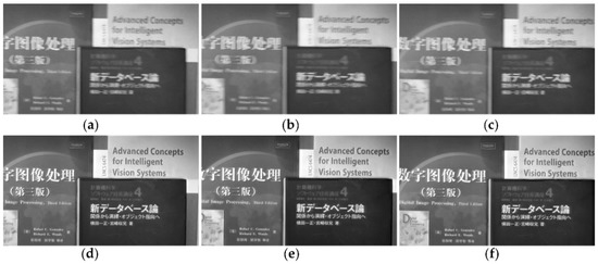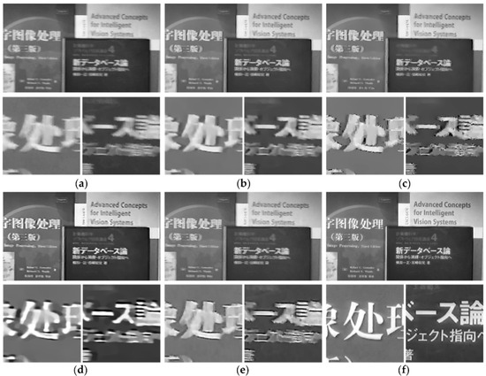 In addition to some artificially blurred videos, we also apply the proposed method to naturally blurry videos to further demonstrate the effectiveness of our method. Figure 11 shows the deblurred results of the naturally blurry video by our method. Figure 11a–c is the consecutive three frames of the naturally blurry video book which are captured by a SONY HDR-PJ510E hand-held camera with translation motion in the horizontal direction and slight camera rotation. The original color videos are transformed into grayscale. Figure 11d–f is the corresponding deblurred frames of Figure 11a–c by our method. Since we assume that there is no sharp frame in the blurred video, an image deblurring method should be adopted to restore the first frame. Here, we use method [32] to estimate the blur kernel and use the latent sharp frame restoration method without temporal cubic rhombic mask to restore the first frame. Then we utilize the proposed spatiotemporal frame correlation method to deblur the remaining frames in the group.
