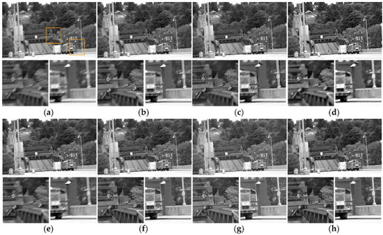In Figure 14b,c, the frames deblurred by methods [3,4] contain noticeable ringing artifacts and burrs. The deblurred frames by method [22,32] present massive blocky deformation and lose many details. In Figure 14f, method [17] fails to deblur the region around the traffic lights. Method [17] cannot properly match a sharp patch with a burry one in the presence of saturated pixels. Moreover, this method would fail when the frames are constantly blur since it needs to find sharp patches. As illustrated in Figure 13 and Figure 14, our method obtains better or similar results than method [17]. The general video deblurring method [25] also produces relatively good quality results. However, the over-smoothing phenomenon can be observed in Figure 14g, where many details are lost, whereas, our method produces a relatively reasonable deblurred result with significantly sharper edges and more visible details than the other methods. In addition, method [25], which calculates the blur kernel of each pixel, requires huge storage space and long processing time.