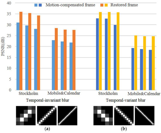 To illustrate the influence of the motion-compensated frame on the final restored result, we execute the experiments on the static and dynamic scene videos stockholm and mobile & calendar, respectively. For the temporal-invariant blur, the blur kernels used for degradation are linear motion blurs, such as Figure 16b. For the temporal-variant blur, the first frames are blurred by the blur kernels as Figure 16a and the corresponding second frames are blurred by the blur kernels as Figure 16b. Figure 16a,b are the blur kernels of the 45 and 135 degree directions, and the blur kernels sizes are 5 pixels, 15 pixels, and 25 pixels, which correspond to mild blur, moderate blur and severe blur, respectively. The top of Figure 16 shows the PSNR results of the motion-compensated frame and the restored frame for the artificially blurred second frame by our method. The artificially blurred second frames and the corresponding restored frames are shown in Figure 17. Comparing the results as shown in Figure 16 and Figure 17, due to our method has great robustness to the error of motion estimation and compensation, the restored frames have sharp edges and visible details, and the PSNR results of the restored frames are significantly higher than that of the motion-compensated frames.