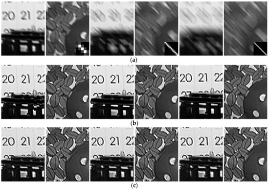 The motion-compensated frame and the restored frames by our method. (a) The artificially blurred second frames with the blur kernels of Figure 16b. (b,c) are the corresponding restored frames of (a) in the situation of temporal-invariant and temporal-variant blur, respectively.