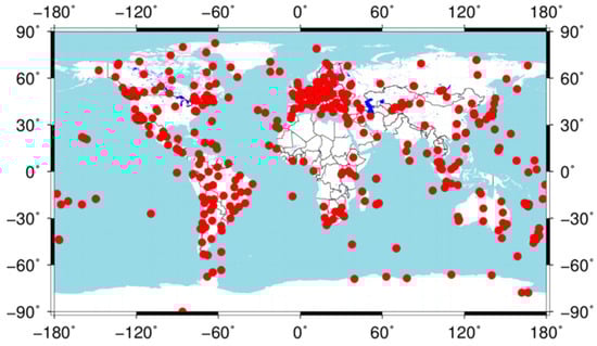 In this work, the GPS dual-frequency data provided by the IGS are used to investigate the effects of storms with different intensities on GPS PPP solutions (ftp://cddis.gsfc.nasa.gov/). There are about 500 continuous operation tracking stations distributed as shown in Figure 2. Besides, the global TEC maps with a time resolution of 5 min derived from the worldwide GNSS stations are used to analyze the ionospheric response to various geomagnetic storms. The TEC map data can be freely accessible from the CEDAR Madrigal database (http://cedar.openmadrigal.org/ftp/).