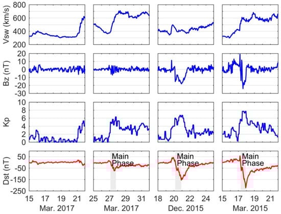 Geomagnetic storms, i.e., large-scale disturbances in the Earth’s near-space environment, are caused by the enhanced solar wind and its interaction with the magnetosphere–ionosphere–thermosphere system. According to the Dst index derived from near-equatorial geomagnetic measurement, the principal feature of a geomagnetic storm represents an obvious decrease of the horizontal intensity of Earth’s magnetic field followed by a recovery []. The disturbance that drives geomagnetic storm can be due to the occurrence of coronal mass ejections (CMEs) on the Sun and the associated interplanetary shock waves or corotating interaction region (CIR) produced by high-speed solar wind streams in the interplanetary medium [,]. Generally, a geomagnetic storm consists of three periods, i.e., initial phase, main phase, and recovery phase [].