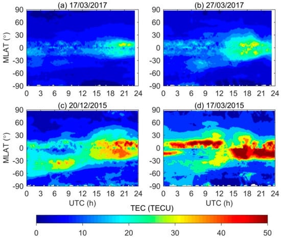 The temporal TEC variations from 90° S to 90° N MLAT on: (a) 17 March 2017 as the quiet day reference; (b) 27 March 2017 as the moderate storm; (c) 20 December 2015 as the intense storm; and (d) 17 March 2015 as the super storm, respectively.