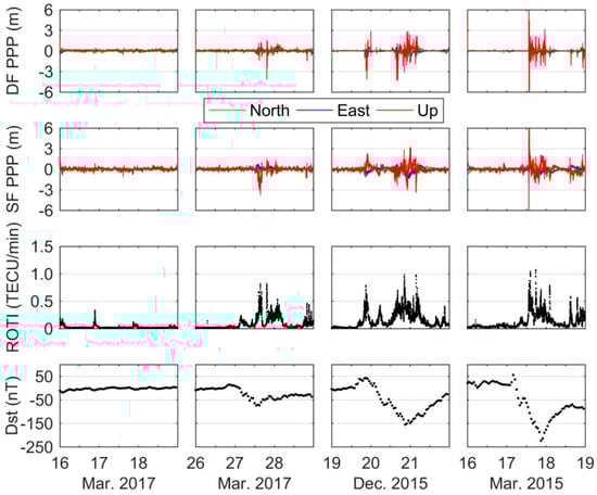 Figure 5 shows the positioning errors of GPS DF and SF PPP in the north, east and up components for the KIRU station (67°51′ N, 20°58′ E; geomagnetic: 65°15′ N, 115°20′ W) during each storm within three days. Positioning errors on 16–18 March 2017 under normal ionospheric condition are also presented in the figure for comparison. The ionospheric irregularities index as ROTI and geomagnetic index as Dst are given in the bottom panels of Figure 5. Under quiet condition of 17 March 2017, the positioning results show smooth variations with 99.2% and 92.7% of errors in the range of ±0.3 m for DF and SF PPP. However, during geomagnetic storm periods, the time series of positioning errors vary significantly especially in the up component regardless of DF or SF PPP. For instance, the positions of DF PPP during 13:00–23:00 on 17 March 2015 show outliers reaching 12.293 m, 3.693 m and 22.009 m in the north, east and up components, respectively. The detailed statistics of DF and SF PPP results are presented in Table 2. In Figure 5 and Table 2, we can find that stronger intensity geomagnetic storms generally cause more significant degradation of GPS PPP.