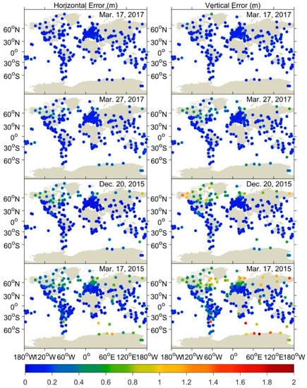 The corresponding results of GPS SF PPP are shown in Figure 8 and Figure 9. Similar to DF PPP, the degree of deterioration for SF PPP mainly depends on the intensity of geomagnetic storm. Due to the lack of L2 observations, the performance of SF PPP is inferior to that of DF PPP regardless of quiet or disturbed condition. Under quiet condition, the 3D RMS of SF PPP are 0.341 m, 0.361 m, and 0.456 m in high-, mid-, and low-latitude regions (see Table 3), which is consistent with the previous study []. During geomagnetic storms periods, it can be found that stations experiencing degraded positioning of SF PPP are mainly distributed in high-latitude region. Their 3D RMSs during moderate, intense, and super storms are 0.963 m, 0.911 m, and 1.624 m (see Table 3). Note that, during a super storm period, the degradation of SF PPP can also be clearly seen in mid- and low-latitude regions. Nava et al. [] pointed out that, during the super storm period on 17 March 2015, the extreme ionospheric conditions have been observed in mid- and low-latitudes. Therefore, the deteriorated ionospheric correction caused by large gradients of ionosphere under super storm condition should be treated as the main reason for the degradation of positioning in mid- and low-latitude regions. It is easy to understand that, under severe ionospheric condition, ionospheric correction is a more serious challenge in SF solution compared with that in DF solution.
