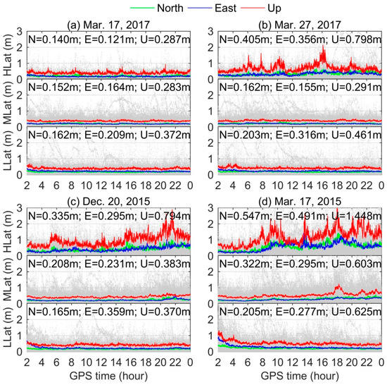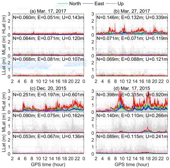 The 90% confidence level of time series of DF PPP results for all stations located at high-, mid-, and low-latitude regions on: (a) 17 March 2017 as the quiet day reference; (b) 27 March 2017 as the moderate storm; (c) 20 December 2015 as the intense storm; and (d) 17 March 2015 as the super storm, respectively. The background gray scatters are the absolute values of positioning results for each IGS station.