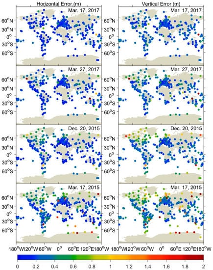 Figure 6 presents the RMS statistics of horizontal and vertical errors of GPS DF PPP for all IGS stations over the global scale for each storm day as well as the quiet day. Since the first two hours (0:00–2:00 UTC) are in the state of convergence in PPP solution, the RMS is calculated based on positioning errors in the period of 2:00–24:00 UTC for each day. The top two panels clearly show that under normal ionospheric condition positioning accuracies of GPS DF PPP in the horizontal and vertical components are better than 0.15 m and 0.2 m. During the moderate geomagnetic storm, some stations located in the high-latitude, e.g. North America region, experience the positioning quality deterioration as their RMS can reach around 0.5 m. With the increase of storm intensity, more and more stations are affected by the ionospheric disturbances, which can be obviously seen in the third and fourth panels. In the vertical component, stations with RMS > 0.5 m account for 1.7%, 7.0%, and 14.6% during moderate, intense, and super storms period, respectively. In addition, there are 19 stations with RMS > 1.0 m during the super storm of 17 March 2015.