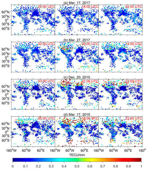 From the ROTI panels, it is observed that under geomagnetic storms conditions the time series of ROTI fluctuate significantly during the main phase as well as the recovery phase period, and the values can increase to around 1.0 TECU/min. Conversely, most of them in the quiet ionospheric condition show smooth variation, being lower than 0.05 TECU/min. Generally, ROTI > 0.5 TECU/min indicates the presence of ionospheric irregularities at scale length of a few kilometers []. Note that there are few abnormal ROTIs being larger than 0.3 TECU/min under quiet condition. The abnormal results can be caused by many factors such as multipath. When satellite signals pass through the ionospheric irregularities, they would encounter signal attenuation, even sometimes complete loss of lock []. Hence, the degradation of PPP during the geomagnetic storm period should be attributed to ionospheric irregularities. The detailed relationship between ionospheric irregularities and degradation of PPP over the global scale are shown below.