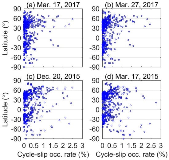 Distribution of cycle-slip occurrence rate against geomagnetic latitude for all IGS stations statistics on: (a) 17 March 2017 as the quiet day reference; (b) 27 March 2017 as the moderate storm; (c) 20 December 2015 as the intense storm; and (d) 17 March 2015 as the super storm, respectively.